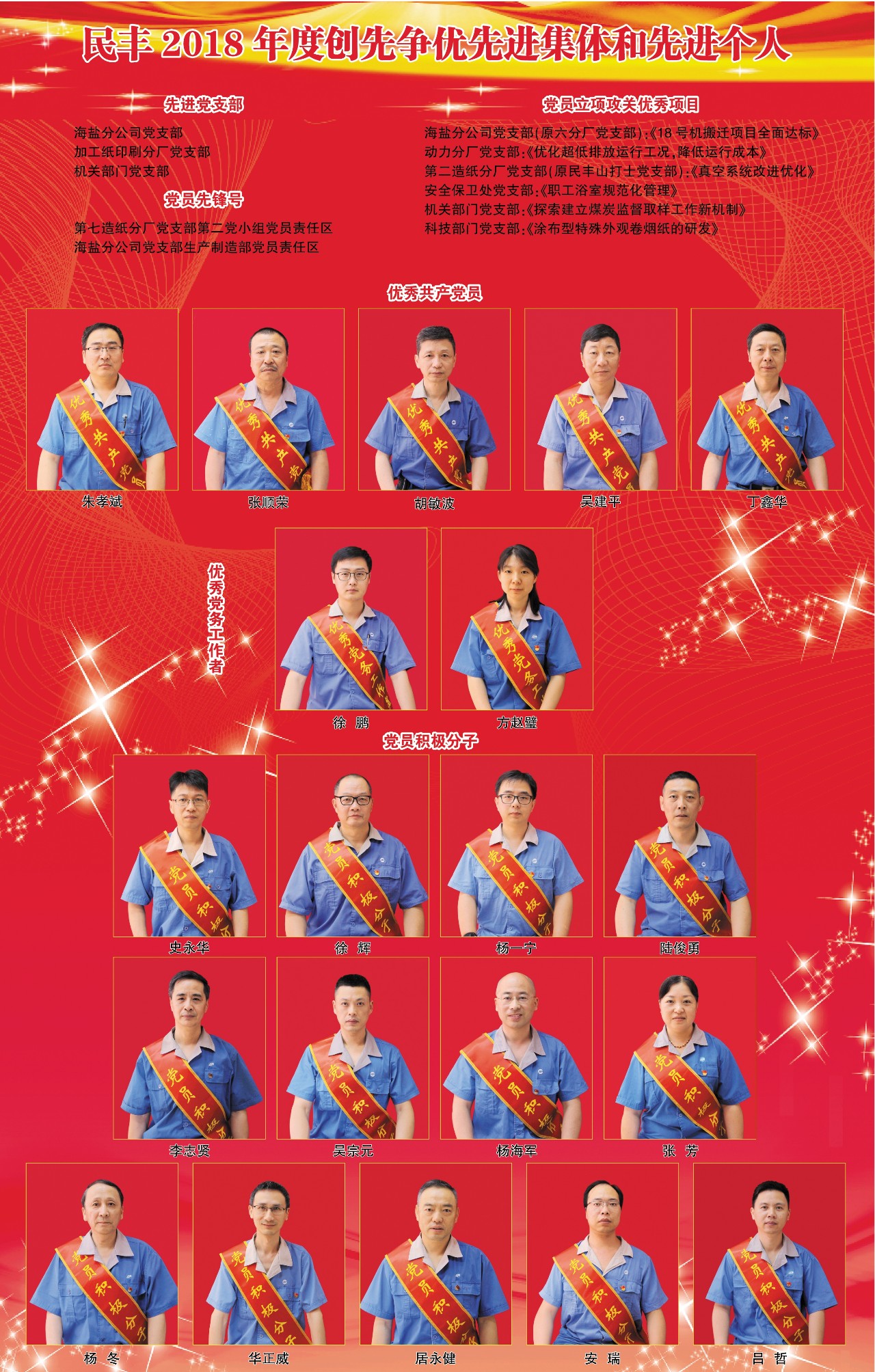 会上,Z6尊龙特纸党委副书记陶毅铭宣读了《关于表彰2018年度创先争优先进集体和先进个人的决定》。大会对海盐分公司、加工纸印刷分厂、机关部门3个先进党支部,七分厂党支部第二党小组党员责任区、海盐分公司党支部生产制造部党员责任区2个党员先锋号,海盐分公司党支部《18号机搬迁项目全面达标》等6个党员立项攻关优秀项目,朱孝斌等5名优秀共产党员,徐鹏等2名优秀党务工作者,史永华等13名党员积极分子进行了表彰。受表彰的先进集体、先进个人代表先后作了经验交流发言。