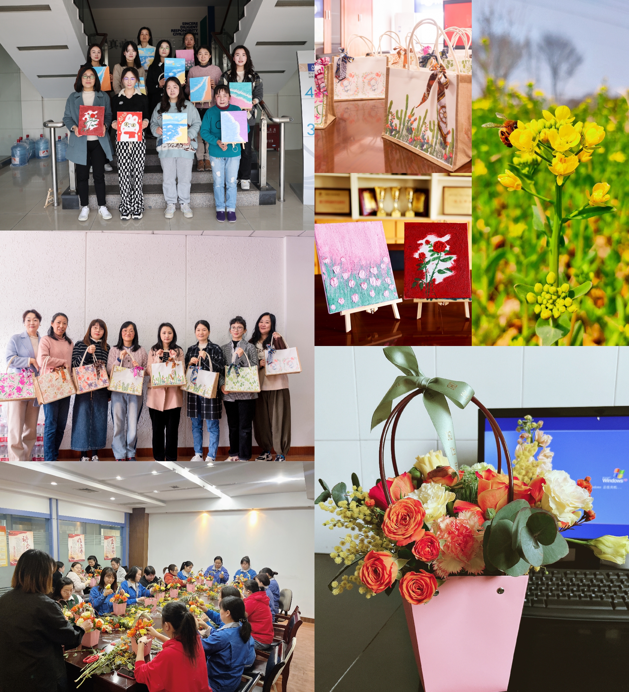 一个小时很快过去,在花艺老师的指导和示范下,女职工们完成一篮篮插花作品,有的花团锦簇,有的含苞待放,错落有致,别具匠心。大家捧起自己的作品相互展示、相互欣赏,拍照留念,享受花艺创作带来的成就感。
